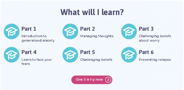 - An online cognitive behavioural therapy course to help users understand and learn how to manage generalised anxiety disorder.