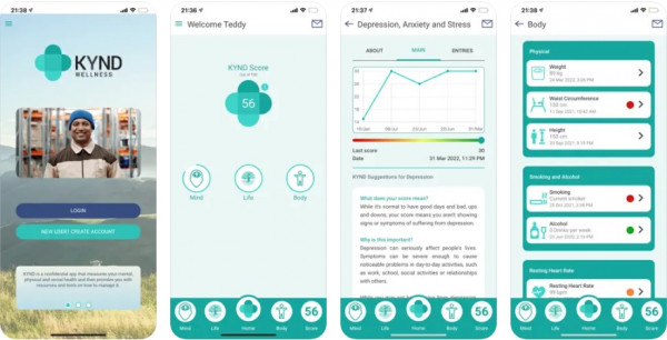 KYND stands for Know Your Numbers Dashboard. The KYND app is divided into 3 main sections relating to physical (body), mental (mind) and social (life) health. Each section has a series of questions which, when completed, provide results using a traffic light display of green (healthy), orange (something is not quite right) and red (risk zone). The app provides people with wellness scores so they can make informed choices and track their wellness journey.