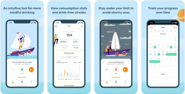 Comments: I found this app a bit strange to use. It has a sailing theme, with the main display as a character sailing on a boat. Your daily alcohol intake affects the weather (eg, if you record several drinks, the weather shown gets windy and then stormy), and your cumulative weekly alcohol intake affects the speed of the boat (the more drinks you've had over the week, the slower the boat travels). The goal is to have your boat going fast in sunny weather. If this type of visual feedback appeals to you, this app may be beneficial.