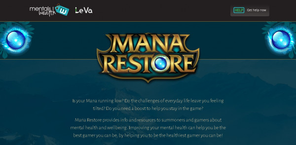 The Mana Restore site is designed to appeal to young gamers. On the home page there are badges with topics including: