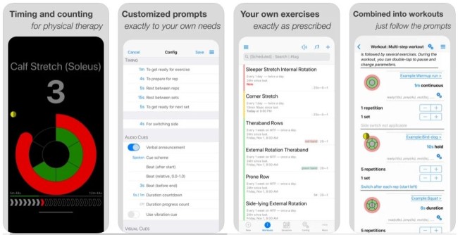 This app provides support for an exercise programme, by offering features like timing, counting, scheduling and reporting. The app stores instructions and pictures of an exercise that the you input. It uses both audio and visual cues to help you do an exercise with the correct hold, rest and repetitions.