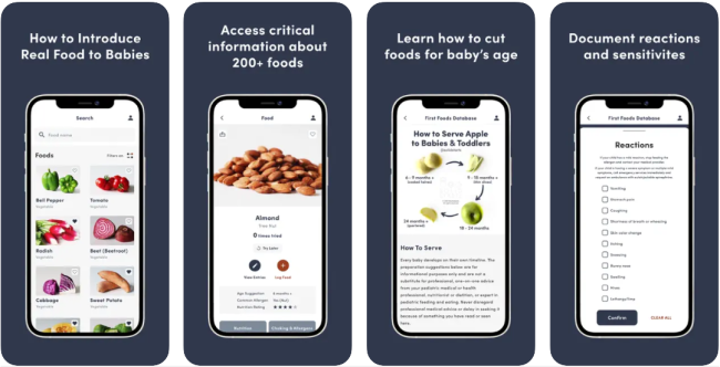 Solid Starts is a food database app which provides users with guidance on what foods to introduce to babies and when. The app provides a database of foods and each food is classified based on allergen status and nutrition rating. Additionally the app provides detailed answers to frequently asked nutrition question and tips regarding the food, images and description on how to serve the food to different age babies and children, video demonstrations of the children eating the food, recipes and flavour pairing. Purchased subscription allows for recording food, ability to record reactions and notes, save favourite foods and track milestones.