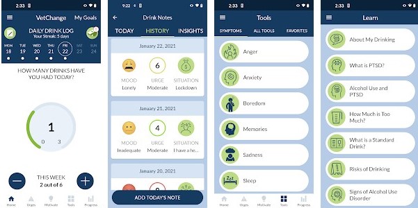 The VetChange app is for people wanting to cut back on their drinking and learn how to manage symptoms of post-traumatic stress disorder (PTSD). Although there's a focus on veterans and military service members, other people can also benefit from this app.