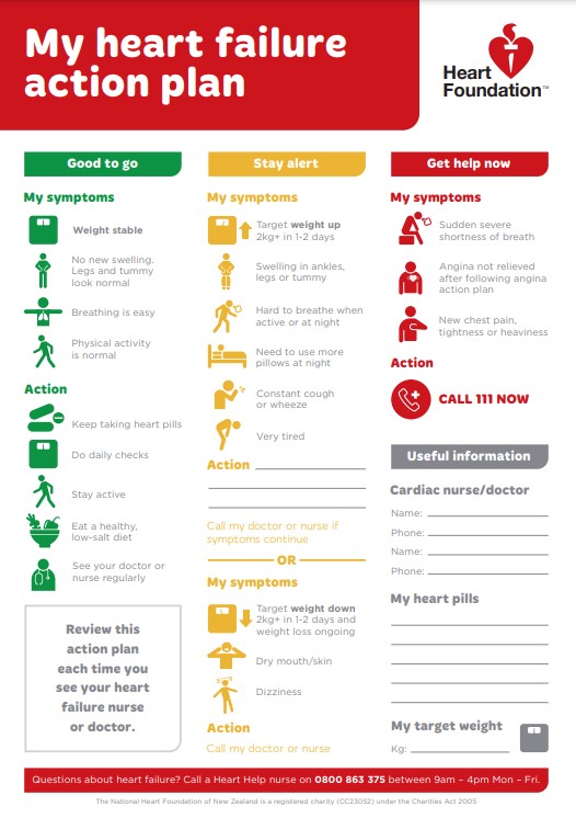 Here's an example of a heart failure action plan(external link) by the Heart Foundation NZ.