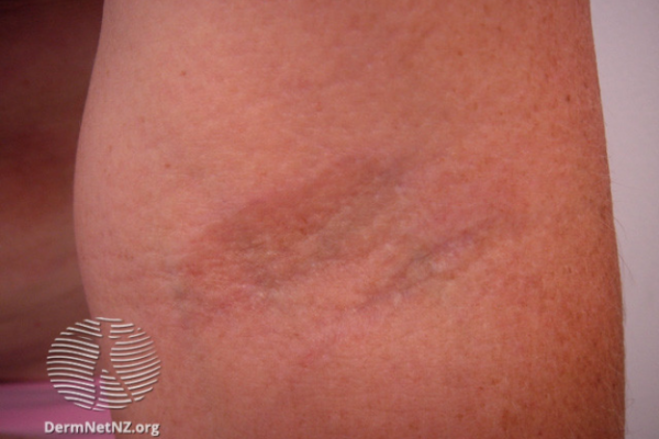 Linear scleroderma is thickened skin occurring in lines along the face, scalp, legs or arms. Occasionally it affects underlying bone and muscle. Linear scleroderma may improve after a few years, although it can affect the growth or movement of limbs.