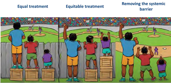 In this illustration the first picture shows what happens when everyone gets the same. In the second picture we can see that each person gets the support they need to see the game. The third picture shows everyone being able to watch the game without additional supports because the systemic structures and biases that cause the inequity have been removed.
